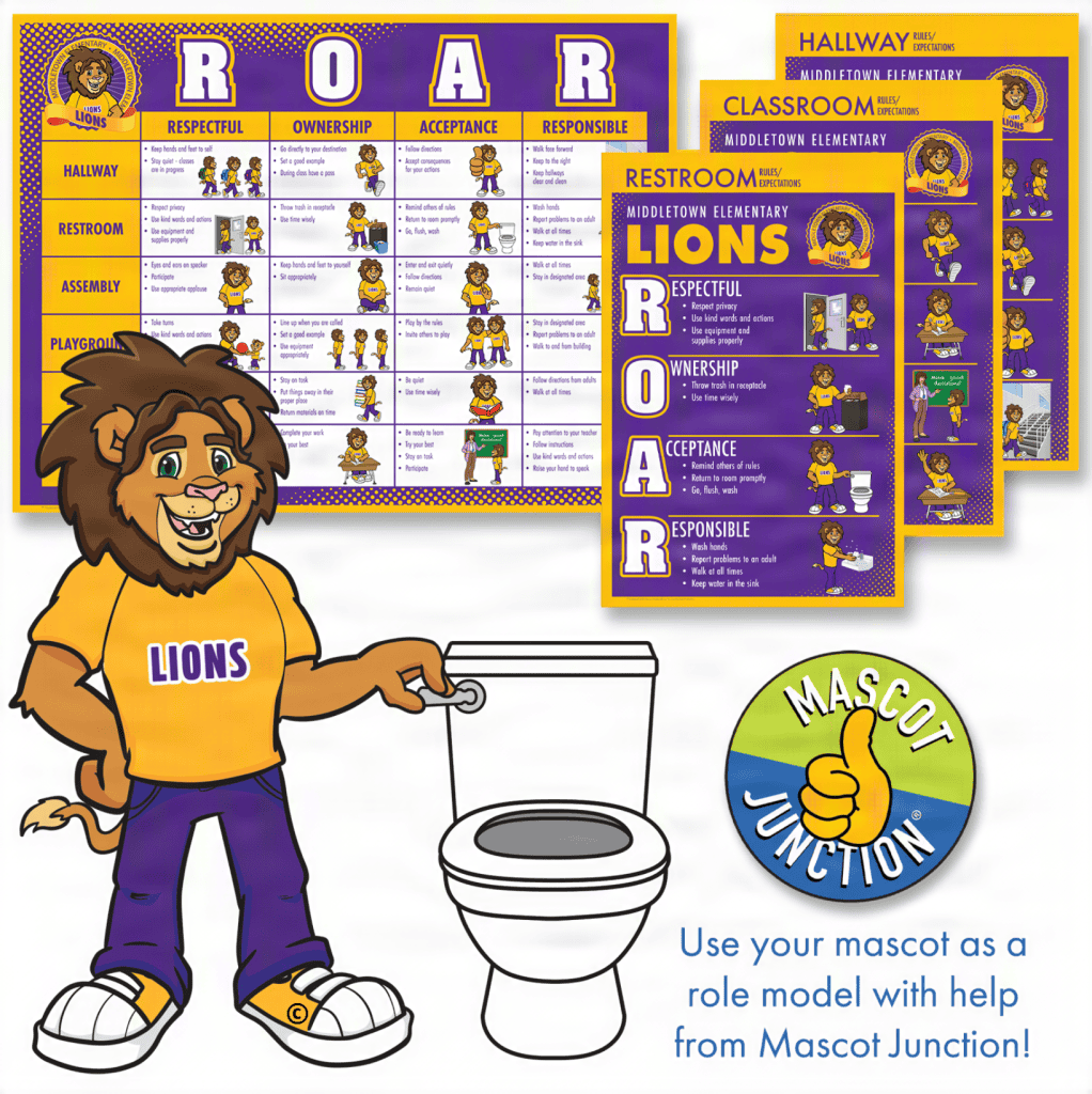 Using your Lion mascot as a role model in PBIS Matrix and Rules Posters is an effective way to bring your PBIS program to life. The benefits are many. It helps low- and non-readers understand the behavioral expectations of your PBIS program. It is a great way to get enthusiasm from students and staff. It is an excellent way to make your PBIS program more engaging and inclusive. It also helps build a strong sense of community around your Lion mascot and your targeted behaviors. Because your Lion mascot is the common thread that runs through your entire school, it dovetails seamlessly with everything your school does.